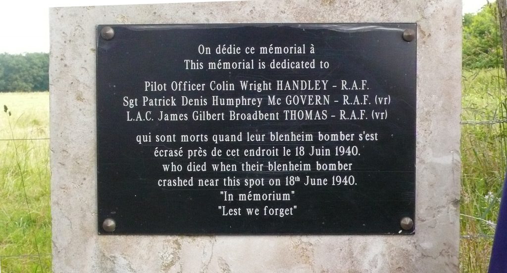 Bristol Blenheim Mk.IV L9317, 4 (Continental) Ferry Pilots Pool, RAF: Written off (destroyed) when crashed in France en route to the Middle East. All three crew killed. According to the official Air Ministry file into the incident (File AIR 81/838): « Blenheim L9317 crashed at Charroux, France, 18 June 1940. Leading Aircraftman J G B Thomas, Sergeant P D H McGovern and Pilot Officer C W Handley: report of deaths ».