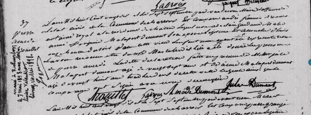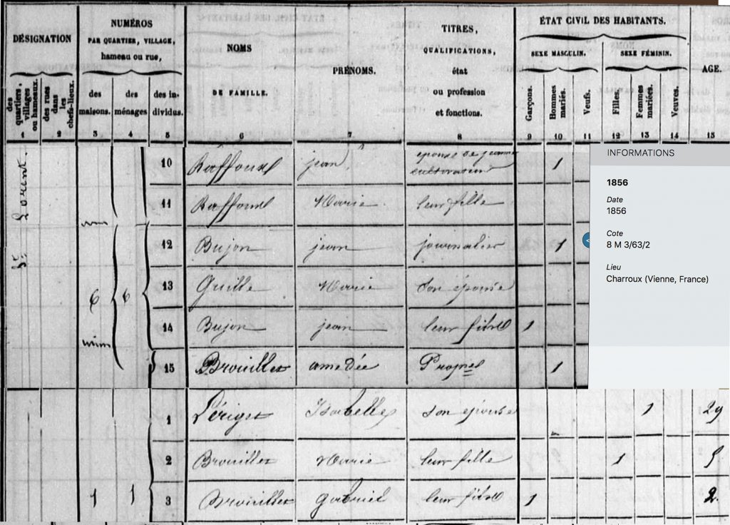 Les recensements avaient lieu tous les cinq ans. Celui de 1856 atteste de la présence à Charroux de Pierre Amédée Brouillet et de sa famille dans le faubourg de Saint-Laurent, berceau ancestral de ses deux familles maternelles (Bourdier-Fayolle dès le 15ème siècle et Machet de la Martinière au 17ème siècle). Un an plus tard, naîtra en ce lieu, son fils Pierre Aristide André Brouillet.